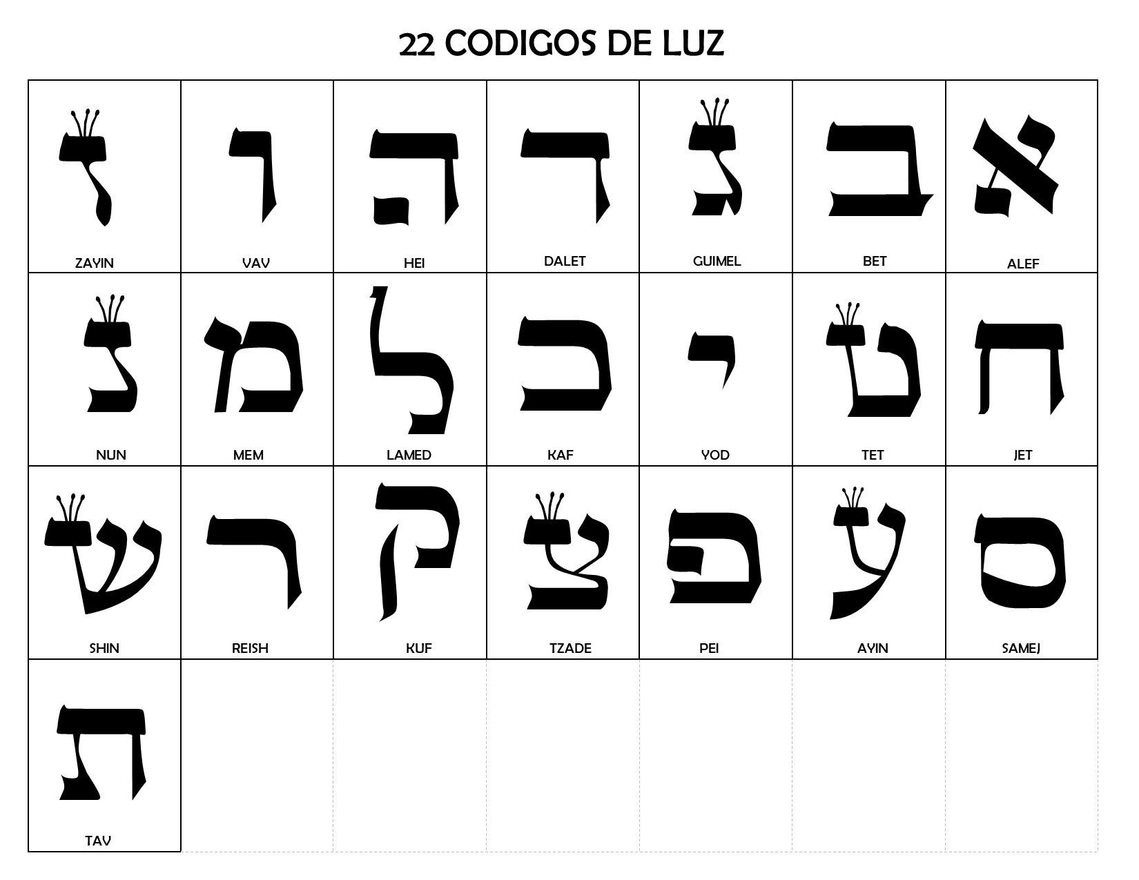 El Zohar (Conjunto de libros que explican la Biblia) nos indica que en la primera Creación del Eterno en el mundo sin fin, Ein Sof, se crearon las veintidós letras o códigos de luz. Estas letras son mucho más que simples símbolos literales de comunicación representados por moldes de una imprenta. Son entidades vivas e inteligentes de fuerza y sabiduría insuperables. Dentro de los planes del Eterno para todo aquello que llegaría a ser, una de esas letras se convertiría en el canal por medio del cual El podría crear su magnifico y multifacético universo físico, que tendría los atributos necesarios para servir de catalizador para la creación de todo, desde los átomos, hasta las galaxias, incluyendo al hombre a imagen de Dios.